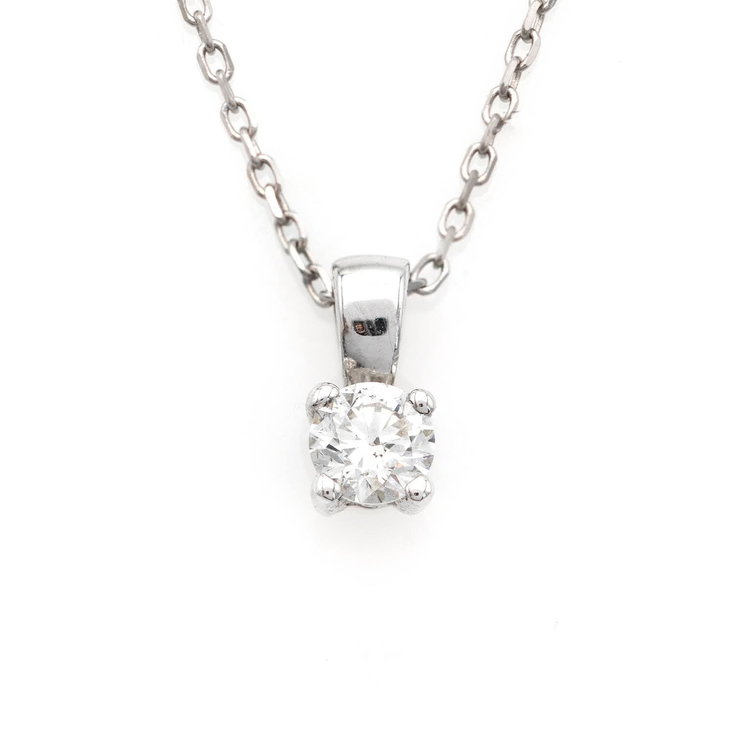 Diamantul natural rotund brilliant de 0.50 carate este setat intr-o montura solitaire rafinata care permite pietrei sa straluceasca spectaculos. Cu culoare D (alb exceptional) si claritate VS1, acest diamant reprezinta cea mai inalta calitate disponibila. Montura eleganta din aur alb de 18K completeaza perfect puritatea diamantului. Lantisorul ajustabil intre 40cm si 42cm ofera versatilitate la purtare.